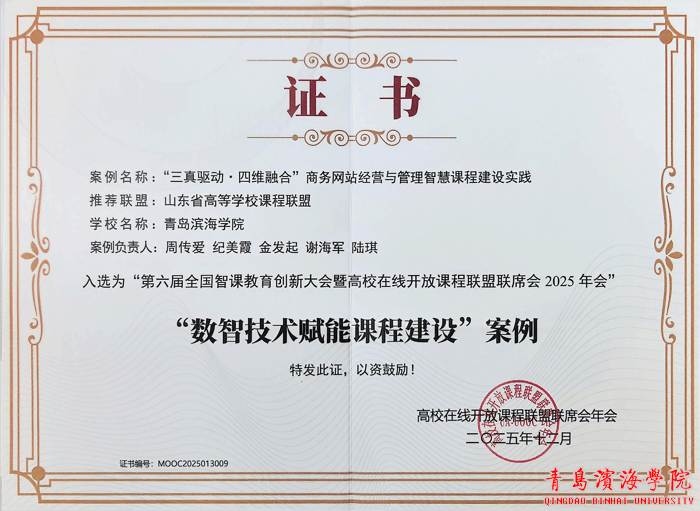 2025年12月13日,第六届全国智课教育创新大会暨高校在线开放课程联盟联席会2025年会在湖北武汉举办。商学院周传爱教授牵头提交的《“三真驱动·四维融合”〈商务网站经营与管理〉智慧课程建设实践》案例,荣获“数智技术赋能课程建设”优秀案例,体现了商学院在智慧课程建设与教学改革领域的探索成果。