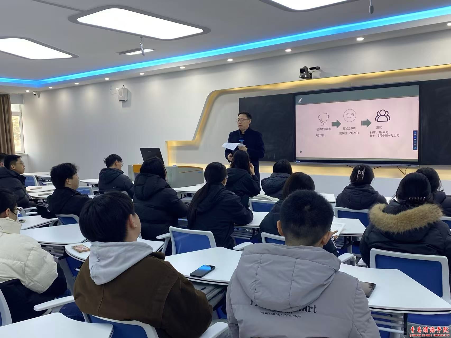 会议伊始,谢海军院长详细梳理了考研复试的时间节点与流程安排。他介绍了初试成绩查询、国家线公布、复试时间安排等关键环节,并解读了进入复试的初试成绩基本要求,帮助同学们明确当前所处阶段和下一步目标。