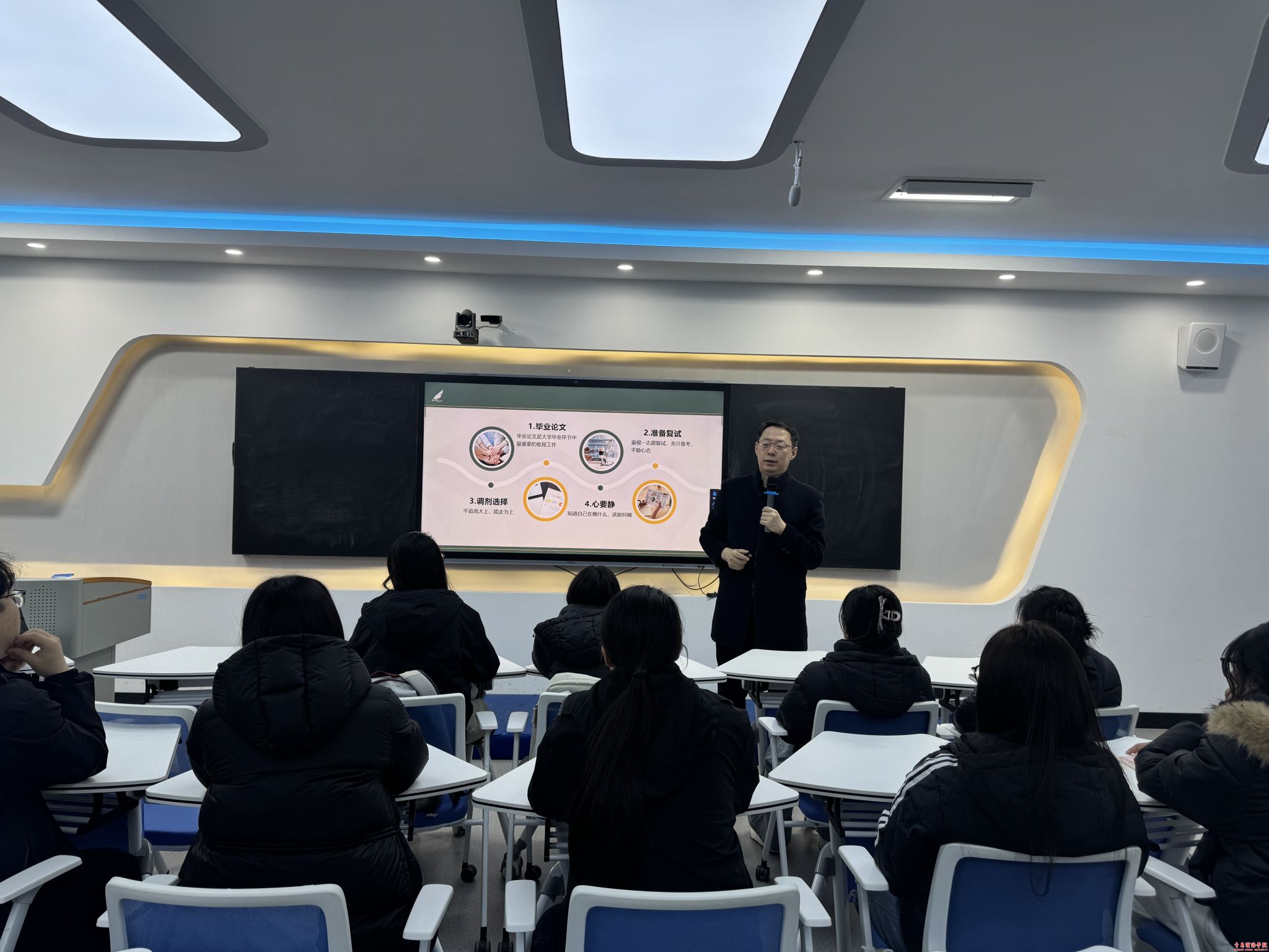 在复试准备部分,谢院长从证件材料、导师联系、英语口语、面试态度等方面逐一讲解。他强调,复试前需备齐学生证、身份证、成绩单、准考证、复试通知等材料;在面试问题回答上,要做到态度诚恳、不卑不亢。他介绍了复试的三大板块——专业测试、英语面试和综合面试,建议同学们收集目标院校往年的复试信息、流程、真题及参考书目,针对薄弱科目重点提升,提前制定合理的复习规划。同时,他提醒大家密切关注研招网及目标院校官网发布的复试文件,确保信息及时准确。在面试准备上,谢海军院长鼓励同学们整理专业活动经历,跨专业考生需研读目标院校导师论文,保持自信从容的面试状态。