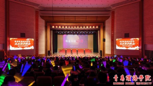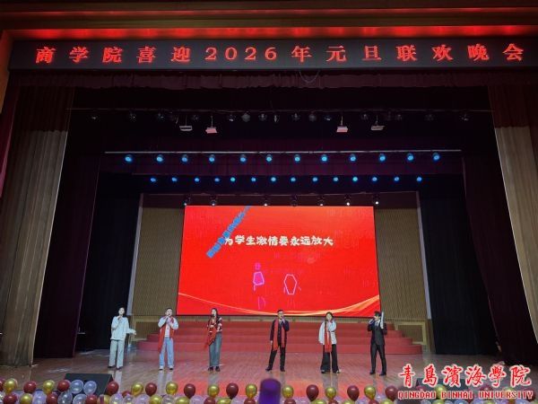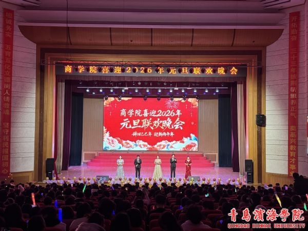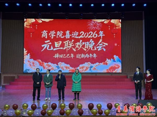 2025年12月31日晚上,商学院在学校礼堂举办喜迎2026年元旦联欢晚会。活动旨在弘扬中华优秀传统文化,唤醒学子青春奋进意识,营造温馨和谐的校园文化氛围。青岛滨海学院副校长李镇江、校长助理兼商学院院长谢海军、世界动物生态博物馆馆长顾永静、继续教育学院院长崔晓敏与商学院全体师生齐聚一堂,共同迎接新年的到来。