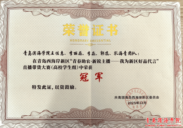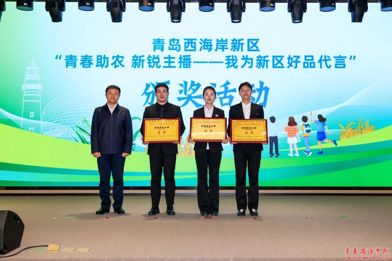 为充分展现青年学子在服务乡村振兴中的担当与能力,深化电商人才培养与地方发展实践的融合,2026年1月14日下午,青岛西海岸新区“青春助农·新锐主播——我为新区好品代言”颁奖活动在西海岸图书馆多媒体报告厅隆重举行。商学院星农企划队全体成员到场参会。